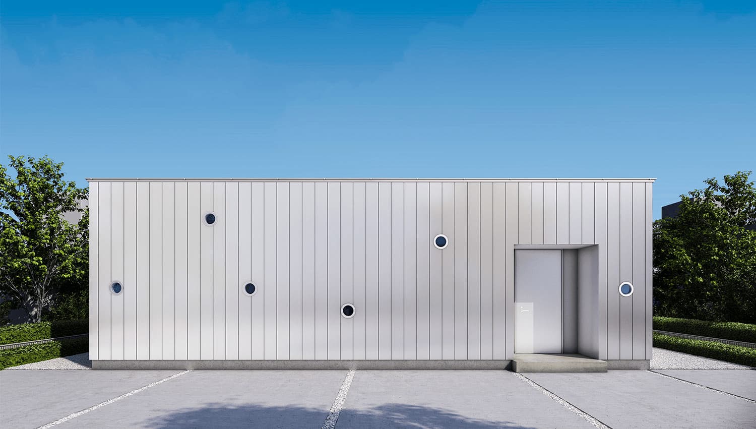 水玉模様の丸窓が、シンプルな外観のアクセント。