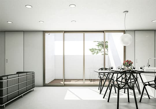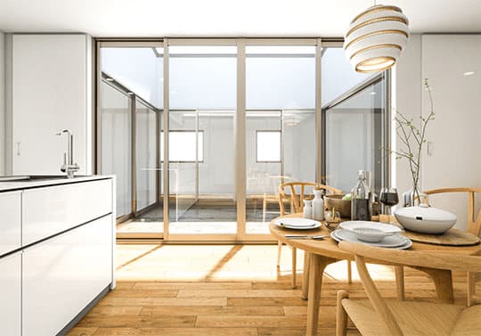 窓が無くて大丈夫なの?と思いがちですが、入ってみるとヒカリが差し込み明るい室内を実現しています。プランによって中庭の全方位から明かりが取れるので常に明るい家が実現されます。