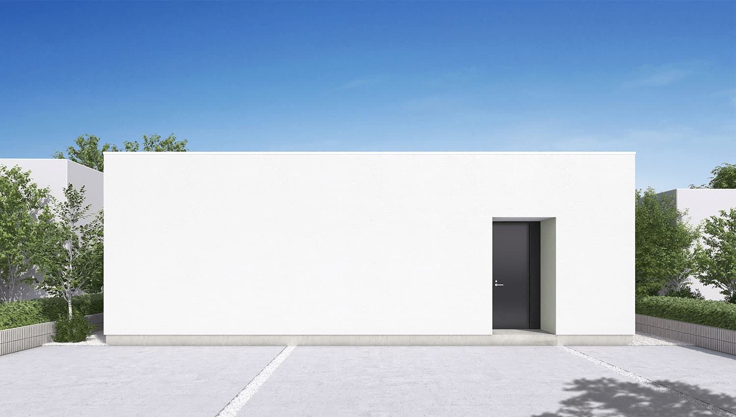 正面に窓を設置せず目に入る情報を最小限におさえた、無駄な線がひとつも無いシンプルなハコ型の家です。廊下がない間取りはデザインだけではなくシンプルな動線をつくり出し、天井まで高く広く設けた窓からはオープンキッチンのLDKに光と風が通り抜けます。